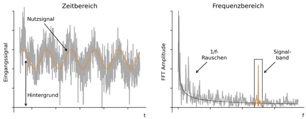 画像2:時間領域(左)および周波数領域(右)における、ノイズの多い有用な信号。妨害振幅が大きいにもかかわらず、ロックインの原理のおかげで、有用な信号を正常に抽出して測定できます。